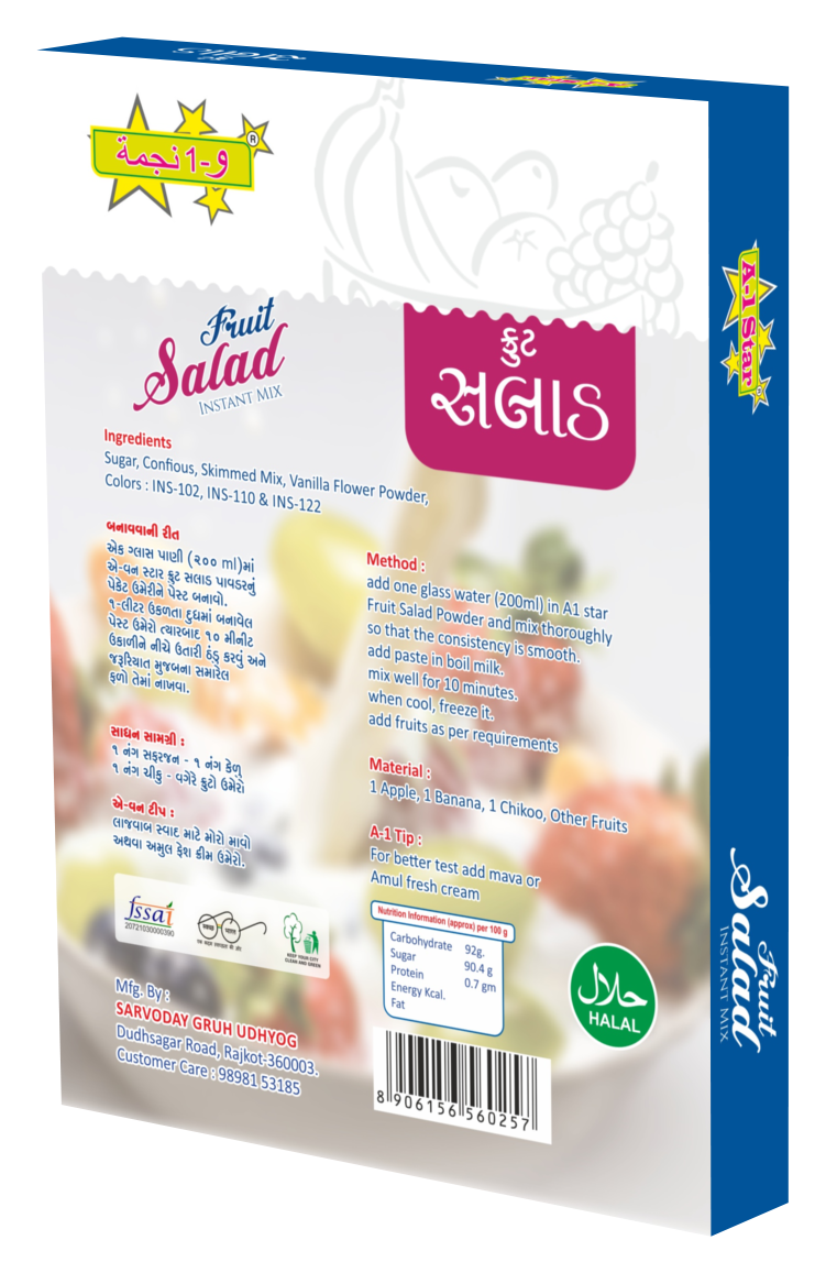 add one glass water (200ml) in A1 star Fruit Salad Powder and mix thoroughly so that the consistency is smooth. add paste in boil milk. mix well for 10 minutes. when cool, freeze it.